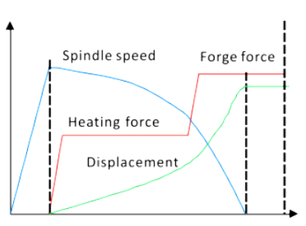 摩擦焊接所需的能量是在預(yù)定的時間內(nèi)通過直接連接驅(qū)動電機來獲得的。一個工件裝在電機驅(qū)動的旋轉(zhuǎn)裝置上,另一個工件固定不旋轉(zhuǎn)。電機驅(qū)動的工件以預(yù)定恒速旋轉(zhuǎn),然后要焊接的兩個工件軸向壓在一起,開始摩擦產(chǎn)生熱量,當(dāng)這種摩擦持續(xù)一段預(yù)定時間或達到預(yù)定軸向縮短量時,將旋轉(zhuǎn)驅(qū)動電機脫開,并快速制動。旋轉(zhuǎn)停止后,頂鍛軸向力在一段預(yù)定時間內(nèi)保持恒定或增加。